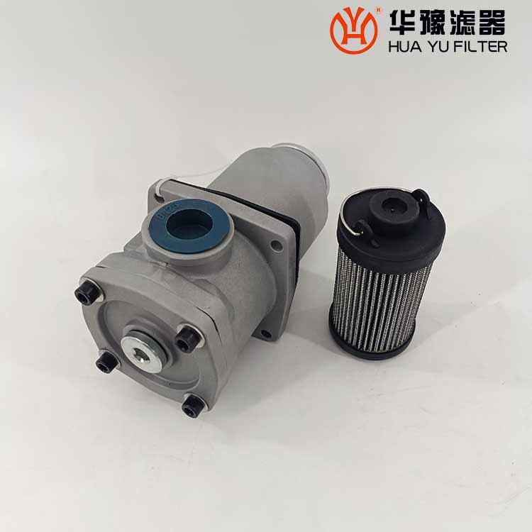 這種過濾器設(shè)有濾芯污染堵塞發(fā)訊器和油路旁通閥,當(dāng)回油壓力達到0.35MPa時,發(fā)訊器發(fā)出開關(guān)信號或報警,還可直接從發(fā)訊器的表盤上讀出回油壓力值,以提示操作人員及時更換濾芯,保證系統(tǒng)油液的清潔度。更換濾芯只需旋開過濾器端蓋即可。當(dāng)回油壓力上升至0.4MPa時,過濾器內(nèi)的旁通閥便自動卸荷,以避免回油壓力過高造成整個系統(tǒng)工作