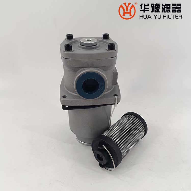 這種過濾器設(shè)有濾芯污染堵塞發(fā)訊器和油路旁通閥,當(dāng)回油壓力達到0.35MPa時,發(fā)訊器發(fā)出開關(guān)信號或報警,還可直接從發(fā)訊器的表盤上讀出回油壓力值,以提示操作人員及時更換濾芯,保證系統(tǒng)油液的清潔度。更換濾芯只需旋開過濾器端蓋即可。當(dāng)回油壓力上升至0.4MPa時,過濾器內(nèi)的旁通閥便自動卸荷,以避免回油壓力過高造成整個系統(tǒng)工作
